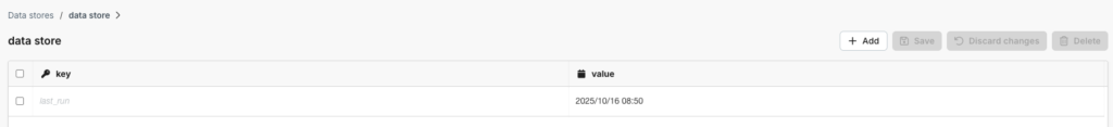 「last_run」をキーにして、Data storeに保存している「value」(前回の実行日時)を取得します。